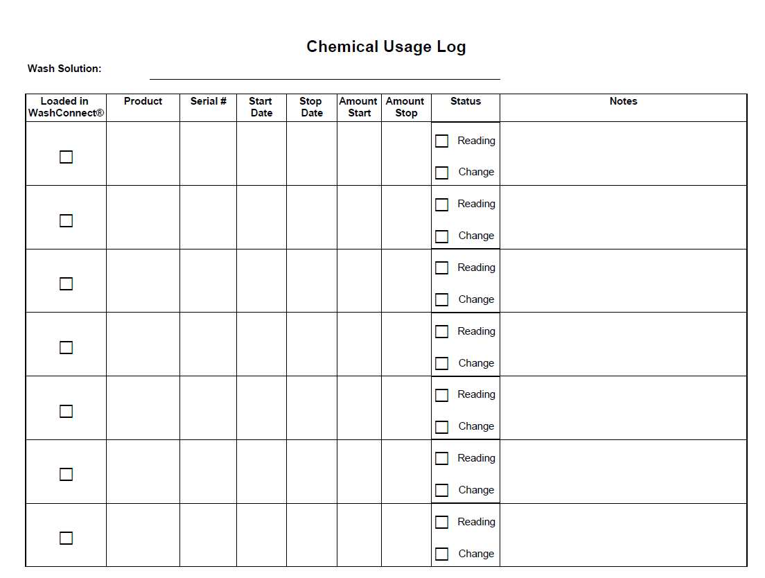 The Chemical Usage Log worksheet is the Download Printable Chart. This log can be downloaded to manually track drum changes which can later be entered in to WashConnect.
