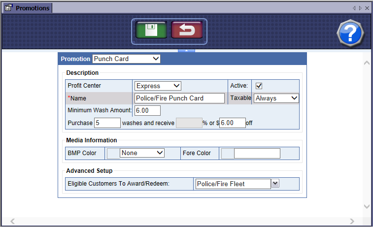 In the dollar $ off amount box, type an amount to give the customer on their next wash after they purchased x amount of washes.