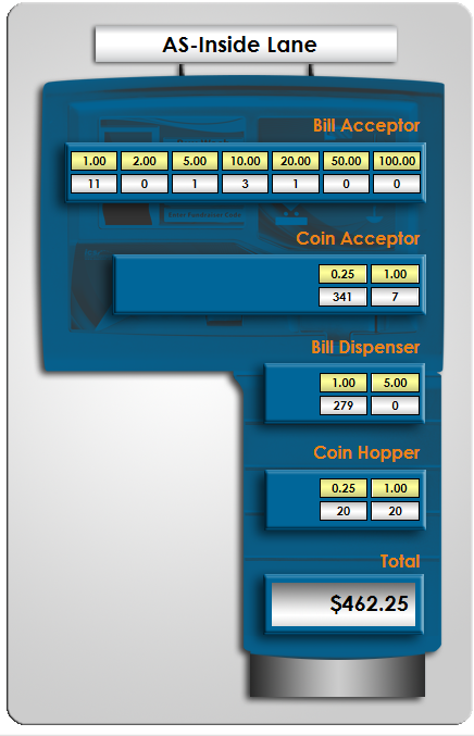 - The white boxes below the yellow denomination boxes are the current quantities or amounts of each denomination currently in the device for each component.