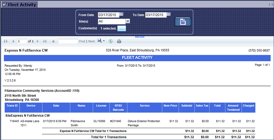 The Fleet Activity report appears. Every fleet customer begins on a separate page of the report.