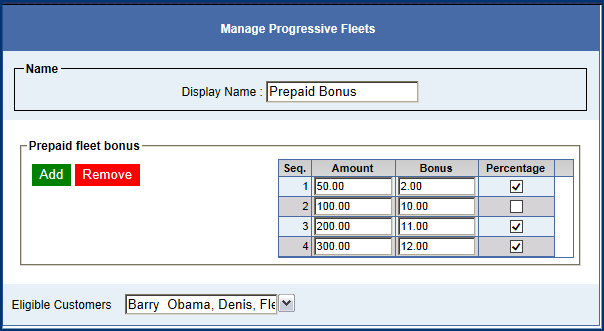 Customers can be rewarded for prepaying larger amounts to their fleet account by offering them progressive bonuses on the amount paid. The bonus can be awarded as a dollar amount or a percentage.
