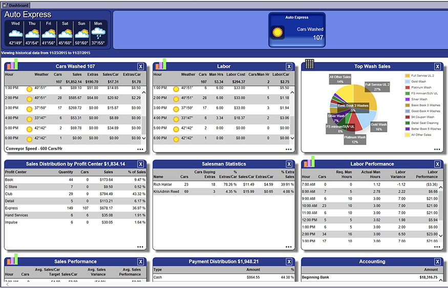 At a glance, Dashboard Reports give the user a summary of site information on an overview page, instead of viewing individual reports. Dashboard Reporting for WashConnect® allows you to select the reports you care about and view them all on one screen at the same time. No more clicking back and forth, or refreshing information to see how your wash is doing. Dashboard reports can be viewed from WashConnect or from a web browser.