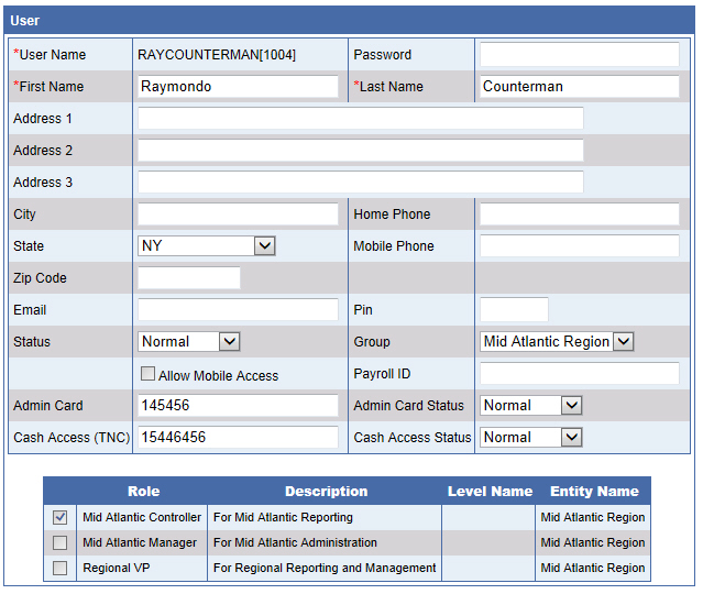 The user MITCHCOUNTERMAN[1010] is a manager. His Role is Tri-State Manger. He can log on at the Tri-State Region group, and he has access to administrative menu items. Therefore, Mitch would see a Configuration menu similar to the one shown in the second example.