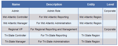 When you actually assign roles to each user, the Role table is generated for you based on what you select in the Group box. For example, if you select Mid Atlantic Region in the Group box, the Role table shows three options: Mid Atlantic Controller, Mid Atlantic Manager, and Regional VP.