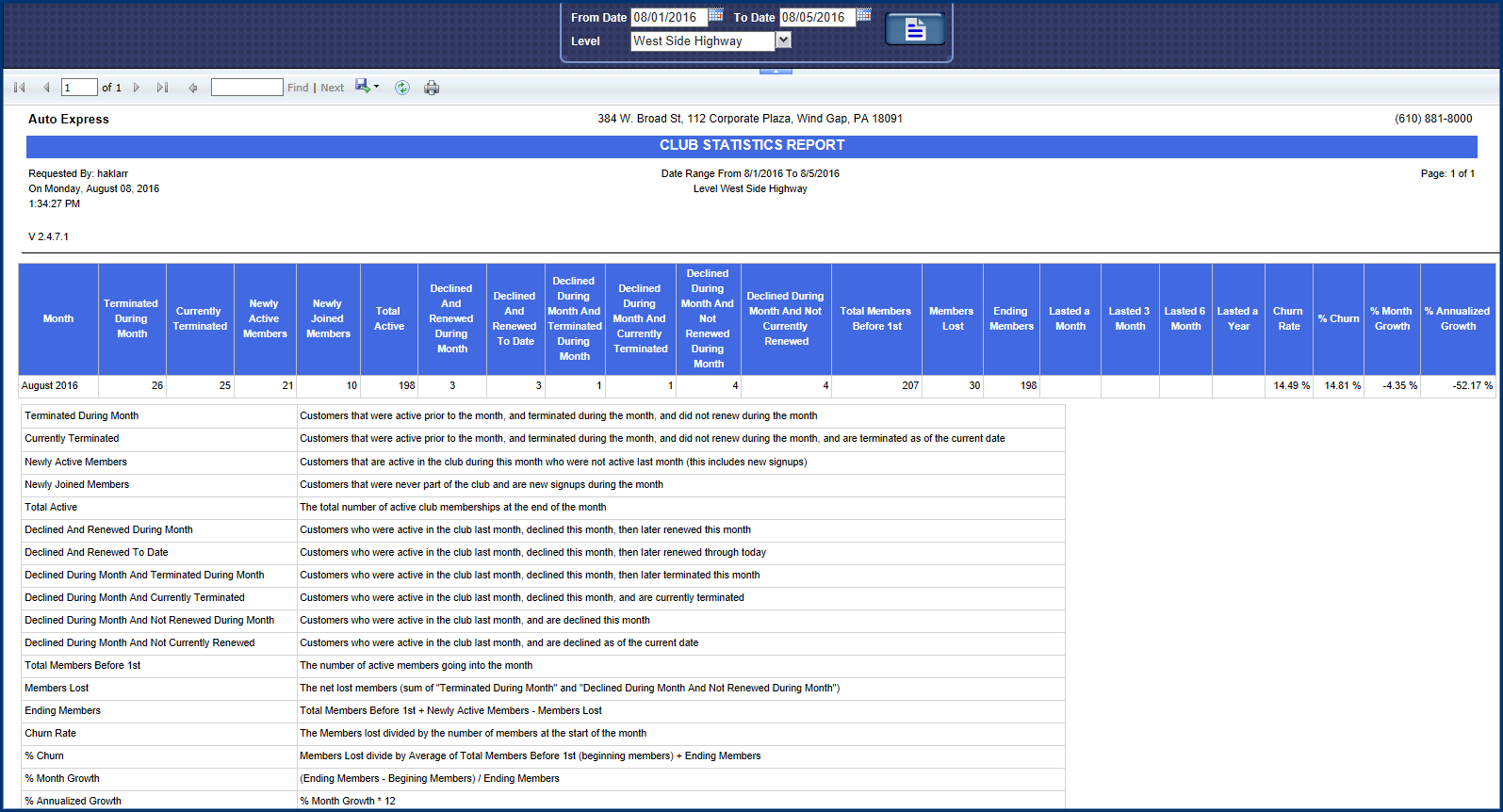 - In the Level box, select the level at which you want to view the club statistics. (Corporate, region, or car wash site).