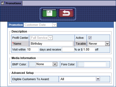 - In and receive %, type a percentage off to give the customer if they purchase a wash within X days of their Birthday, etc.