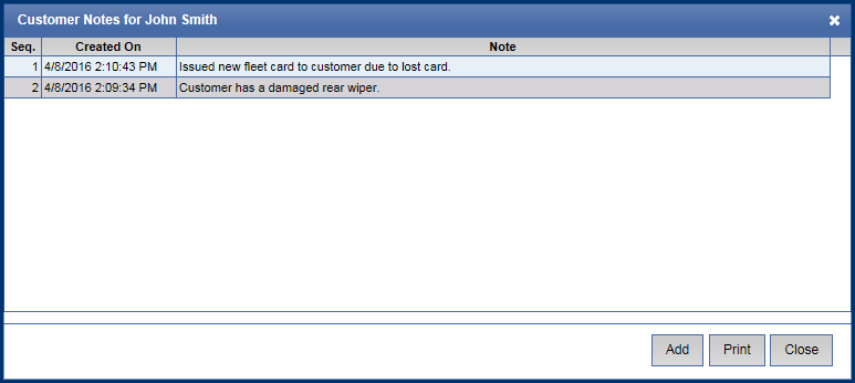 NOTE: Customer and Vehicle notes for a customer can be viewed and printed by selecting the note button under note column for that specific customer. If there are two Note buttons for same customer, the top Note is for Customer notes and the bottom Note is for Vehicle notes.