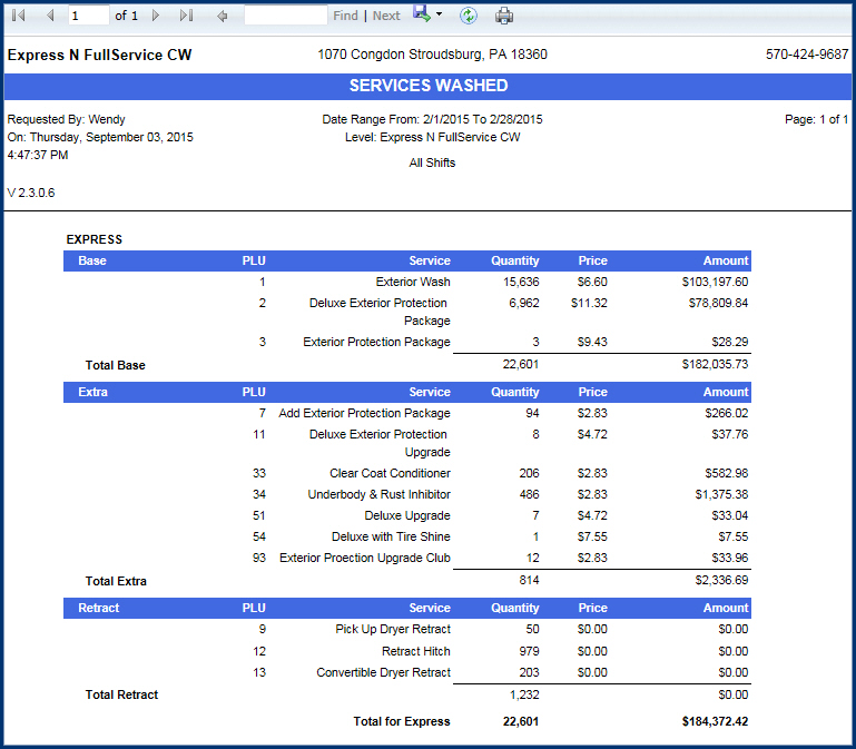This report displays only those services that have been washed. The Services Washed Report records only PLUs that were sent to the Controller from Wash Connect and completed.