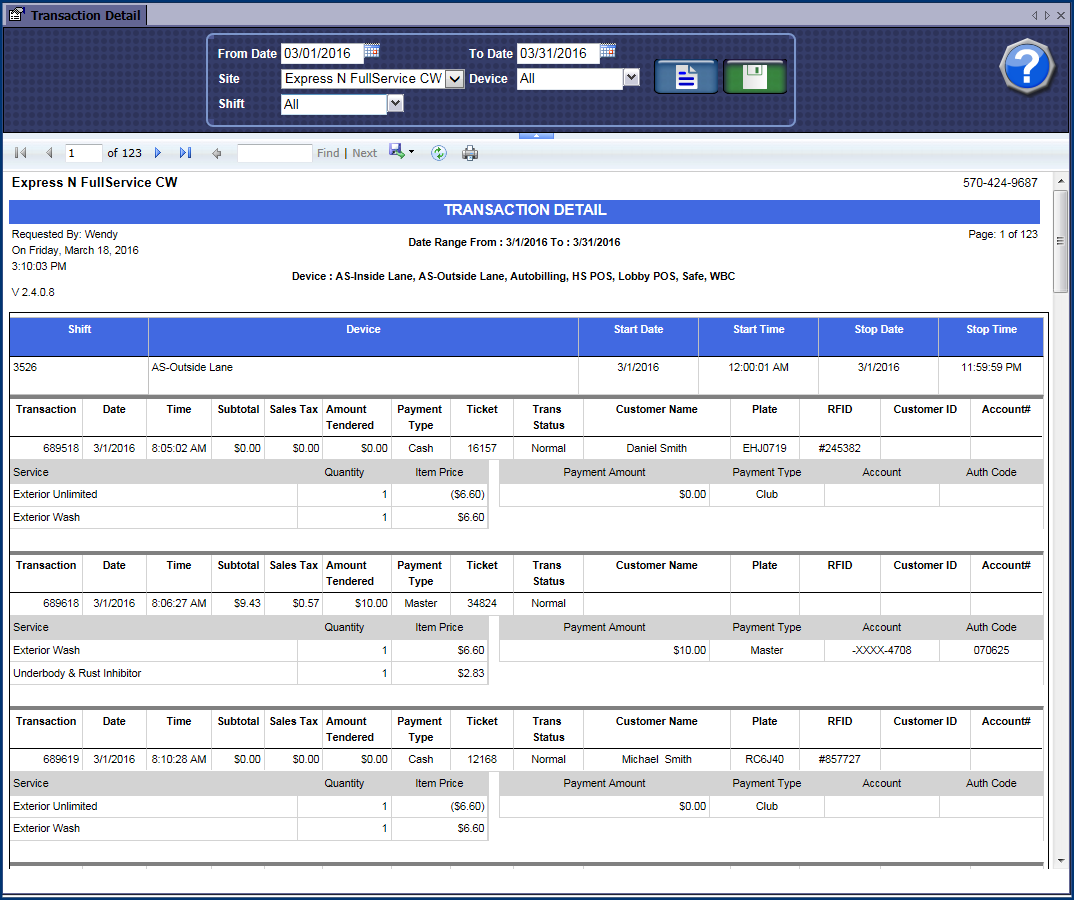 The Transaction Detail Report displays detailed information on all transactions that were sold and are broken down and viewed by Site, Device, and Shift. Users can select to view the information for one or multiple devices and shifts and the report will display information such as the Transaction ID, Date/Time the transaction was sold, Payment Information, Customer Information, and Service Information.