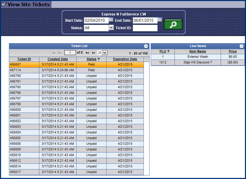 The View Site Tickets Report displays status information for tickets created at the local site or at corporate along with information such as when the ticket was created, when it will expire, the services included on the ticket, and the price of the services. Only tickets created at the local level (5 digit tickets) will show at the local level and only Global tickets (6 and 9 digit tickets) that are created will display when logged into corporate.