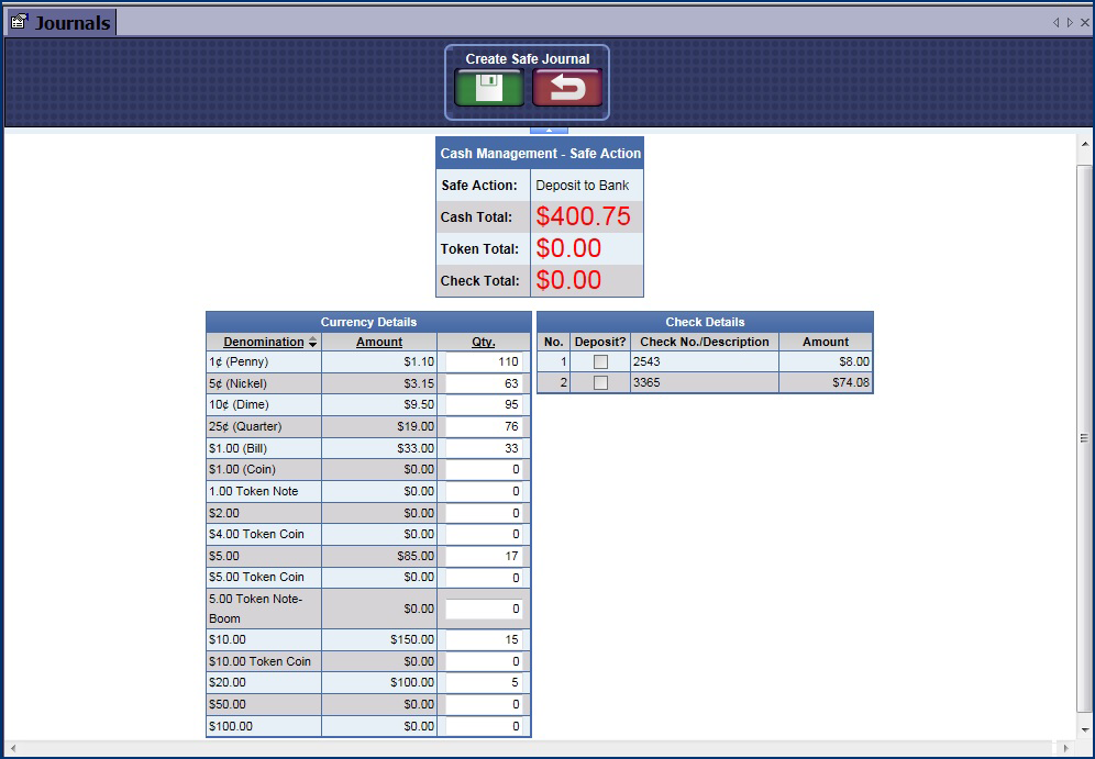 - A journal entry is created which shows the denominations that were removed and taken to the bank. This journal entry is marked as unverified and will need to be verified to ensure the currency is accounted for correctly. See Verify a Journal Entry.