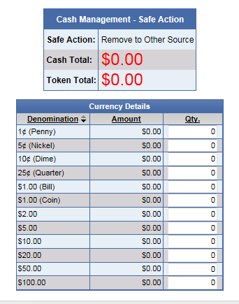 - In the Currency Detail Qty. column, enter the quantities of the individual denominations that will be removed from the Safe and deposited to another source other than the Bank.