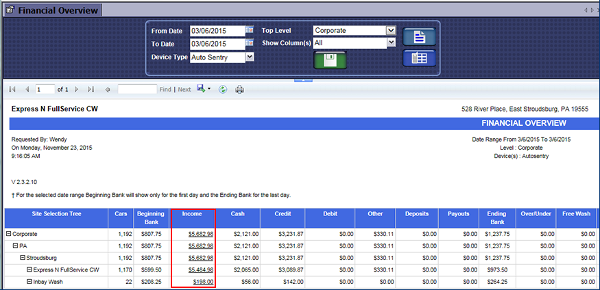 For example, if you click an underlined total in the Income column, the Shift Detail Report appears in a new tab, displaying the details of the Income total field.