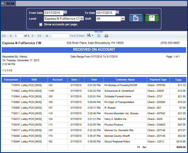 - From the Received on Account Report toolbar, you can Search, Print or Export the report.