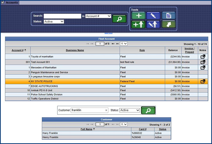 - From the bottom of the Fleet Account list, you can search for a customer in the Fleet Account.
