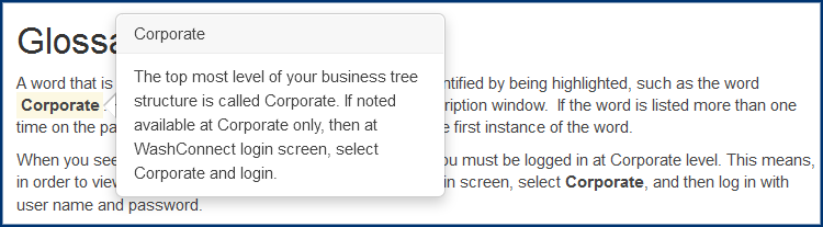 There is a Glossary in WashConnect Web Help that you can find from the Web Help tree. You also may notice a Glossary term that is identified by being highlighted on the Web Help page, such as the term Corporate below. The glossary window will only appear on the first instance of the term if it is listed more than one time on the page.