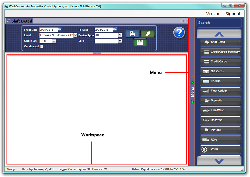 The Menu bar changes according to logon level and user privileges. The logged in User appears in the lower left corner (Wendy). Only the Menu items that the user has permission privileges to access will be displayed.