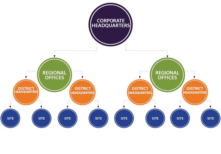 Multi-site installation is used when various locations and levels exist within the organization. In the graphic below, Corporate headquarters is the top level. The regional offices and district headquarters are created levels to view reports for the respective sites. The individual sites are always the bottom most level of the corporate tree structure, but you can always have as many sites as you like.