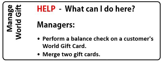 The WashConnect® POS system will not allow the use of more than one Gift Card to pay for the same sale. The WashConnect POS system will also not allow the purchase of a Gift Card to be paid for by another Gift Card. So, if a customer wants to use two different World Gift Cards on the same purchase, you can merge the two gift cards first.