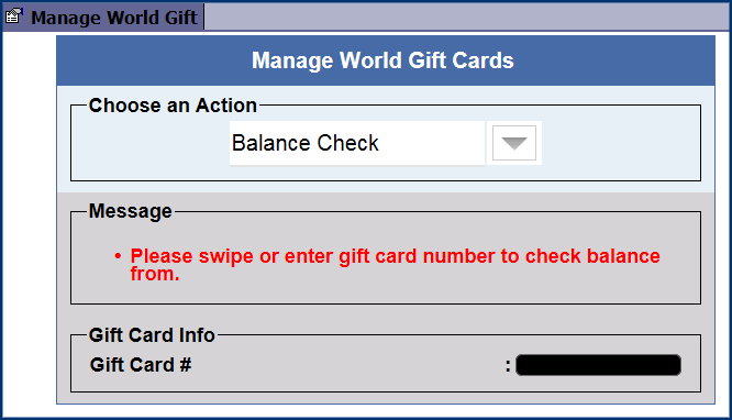 World Gift Card balance check can be performed either by swiping the gift card or typing the gift card number in order to Check Balance from the gift card balance screen. When selecting the Action, Balance Check, the gift card engages a keyboard on the screen to type, or without having to touch the screen, its ready to swipe.