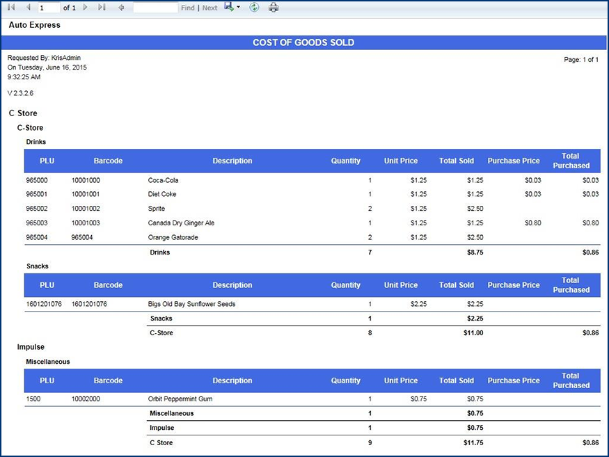 This report displays the individual items within the various profit centers to show full detail of what is being sold and what the cost of those items are to the owner.