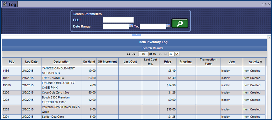 The search results for the Item Inventory Log appear.