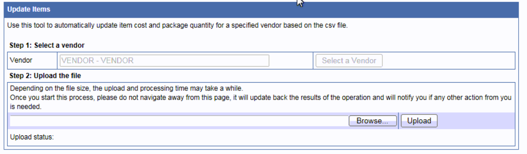 - Browse and upload new csv file to update item cost and package quantity.