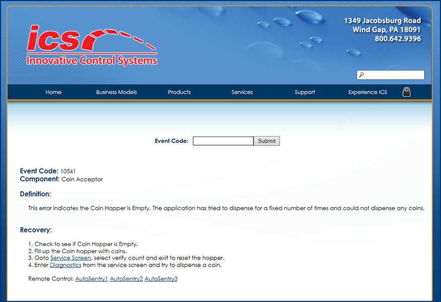 Each error or event code links to an online database with step-by-step troubleshooting instructions.