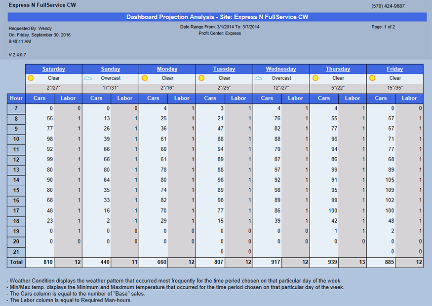 The Projection Report is using the date range selected and showing Vehicle Statistical Performance Report (VSPR) data by the day of the week. The report provides charts and graphs to view the weather conditions, cars washed, and labor man hours required for the selected profit center and specified date range. It can be used to determine how many vehicles are washed on one day compared to another and weather and labor data can be used to determine trends in staffing. For example, if a site normally washes more cars on a Sunday compared to a Monday and they notice that in the month of December they washed more cars on Monday than Sundays analyzing the weather information might reveal that it snowed on the majority of Sundays during the month and therefore customers were visiting the wash on Monday to wash the salt off of their vehicles. This could reveal a trend that on days after a snow storm the site might need more staffing than they normally would on that day, regardless of the day of week, due to customers washing the salt off of their vehicles.