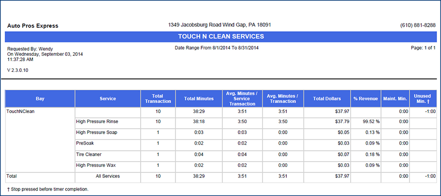 The Touch 'N Clean Usage Report displays the sales and time statistics for each Touch 'N Clean service in each Self-Service bay. It displays the Total Minutes for each service and provides the Total Dollars and % Revenue for each service. The report can be used to determine the number of minutes each service was used while under maintenance and also shows the total unused minutes per Self-Service bay.