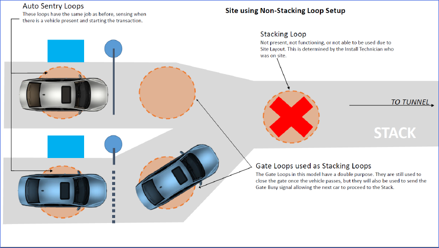 In a Non-Stacking Loop setup, the Stacking loop is not hooked up or does not exist all together. We would need to use the Gate Loops as the Stacking Loops. Both types of Gates have the ability to send a second signal back to the Auto Sentry to use as a Gate Busy.