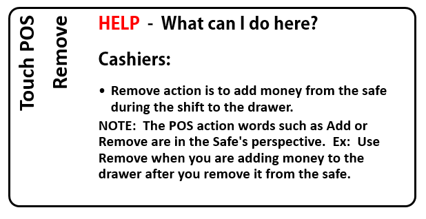 Since you have a POS using an on-site safe, all the journal actions are made from the perspective of the safe. Hence, Remove is referring to removing money from the Safe, not removing money from the POS.