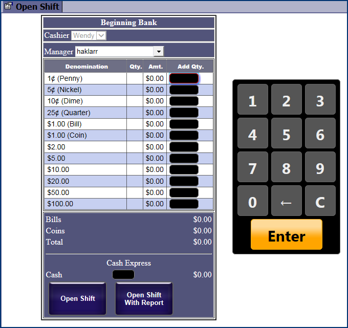 IMPORTANT: Count the money as you add it to the POS drawer as this entry is automatically verified and cannot be edited. Be sure that shifts are opened and closed accurately to assure cash accountability.