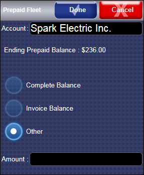 - The Prepaid option is used to add funds to maintain a balance on the Fleet Account which is decremented with each purchase that is made toward the Prepaid Fleet Account. When using a Prepaid Fleet for a purchase on the POS, the screen will display the current balance of the Fleet Account and the balance after the purchase.