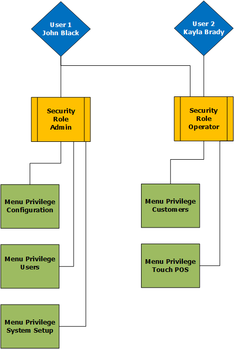 In the following example, User 1 is assigned to the Admin security role which has specific administrative privileges. User 2 is assigned to the Operator role which allows them to manage customer information and Point-of-sale operations. Security roles can be fully customized to meet the various needs of your employees.