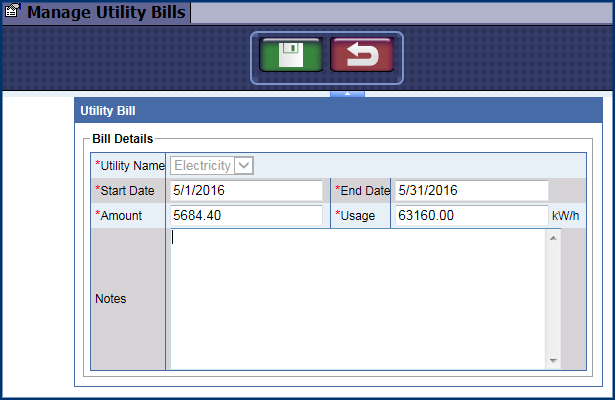 - In the Notes box, enter any notes associated with this utility bill. (i.e.: wash was closed for 2 weeks for repairs so usage was very low.)