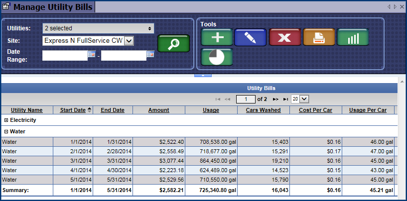 View the utility bills in a tabular format with the date for each bill, along with the cars washed and usage information for the time period of the bill.