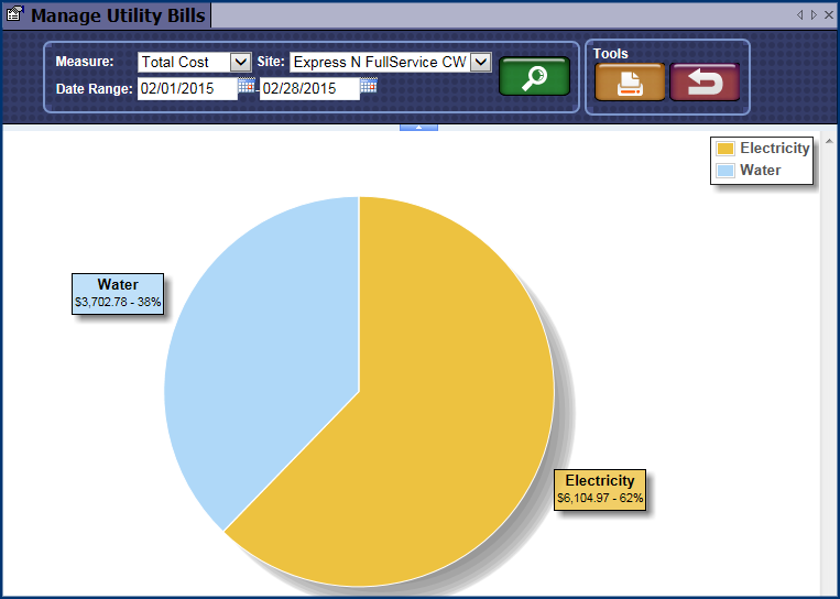 The Utility Breakdown Chart shows the utility usage over a period of time as a pie chart, providing a visual representation of the usage by utility type. Selections can be made to display the Total Cost, or the Cost Per Car over the time period.