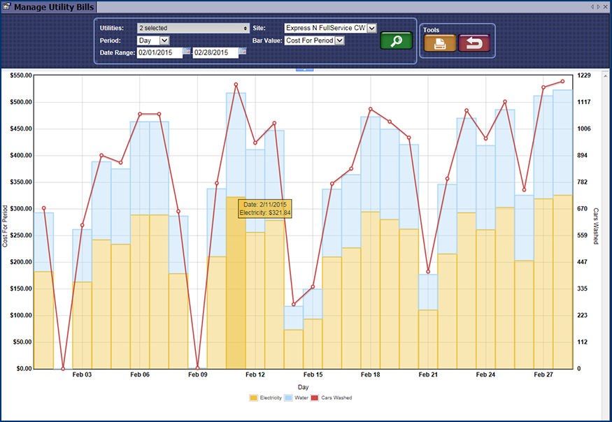 The following is an example of the Utility Usage Chart. The number of cars washed appears on the chart as a red line.
