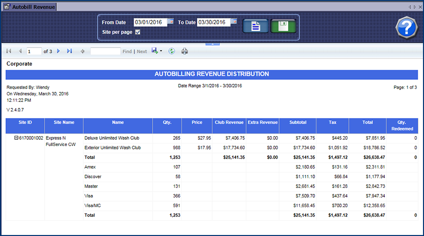 The Autobilling Revenue Distribution report is useful for multiple sites that report to a corporate office, and for independent wash franchises that share programs. The report shows the following: