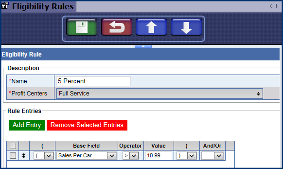 If a site would like to give their greeters 5% commission based on either sales or sales per car in a specific profit center, they should be creating an Eligibility Rule stating that 5% commission is based on either the sales or sales per car.