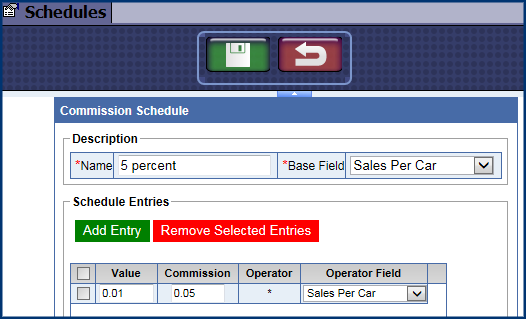 - In the Rule Entries box, set up a rule. For example, see the following entry for this sales commission example where you can pay commission after the sales per car purchase is over $10.99:
