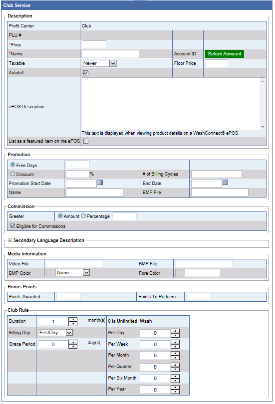 To save the club service quickly, complete the following two required fields: Name and Price.