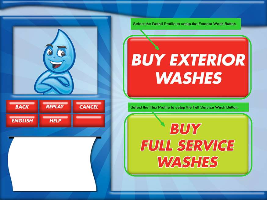 You can offer your customers two different standard profiles or menus on your Auto Sentry®. The Retail Profile or your main menu on your Auto Sentry lists your exterior wash offerings. An additional menu, the Flex Profile, can be engaged if you have full-service wash offerings and extra services. The Flex profile was named because its flexible and can be turned off when your full-service staff are no longer available. If you engage both the Retail and Flex menus, the first screen your customers will see on the Auto Sentry will have two buttons: Buy Exterior Washes and Buy Full Service Washes.