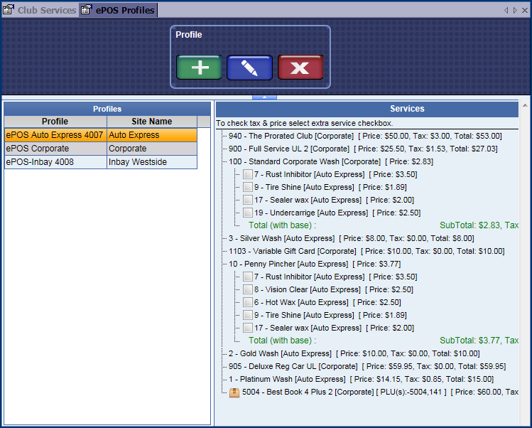 The items assigned in the profiles represent everything you want to sell. This includes base washes and their assigned extras (example below – PLU 100 is a base and PLUs 7,9,17, and 19 are its extra services), Clubs (PLUs 900, 904, 905), Gift Cards (PLU 1103), and wash books (5004).