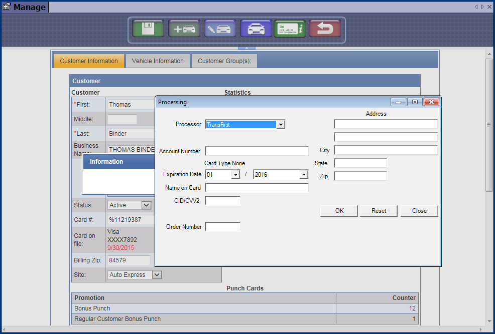 The customer information and vehicle information is saved. If the Billing Status wash changed to Active and the Expiration Date was changed, then auto bill will take place overnight on the Expiration Date.