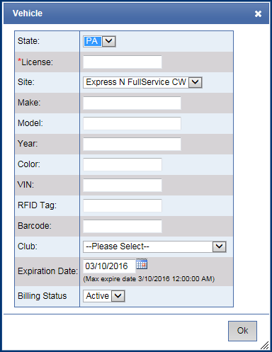 - In the *License box, type the customer's license plate number (*this is the only required vehicle field).