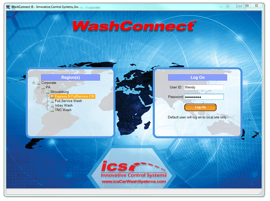 The selected Region and the entered user ID defines which menu buttons, data, and reports you will have access to once logged on. When logging on at a Site level, only that site data is available for viewing and menu items that are only available at Corporate are hidden. Any configuration done at the Site level will be specific to that site, but will also be pushed up the corporate structure until it reaches corporate. When logging on at the Corporate level, the data from all sites will be available for viewing and all of the Corporate only menu items may be accessible, depending on the user’s access restrictions. If your sites use corporate created wash services, they may be created at Corporate and pushed down to individual Regions and Sites.