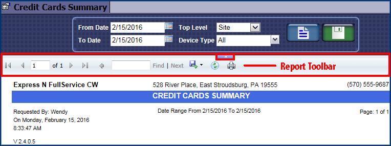 After you set your parameters (for most reports, you can select a Date Range, Level, Device Type, Device, and Shift), you can view the report on-screen. The report toolbar will appear below the parameter selections and above the report header.