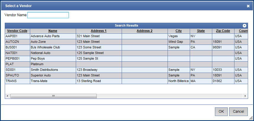 - From the Select a Vendor dialog box, click to select a Vendor.